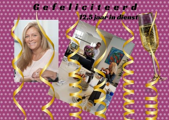 Deze week vieren we het jubileum van onze zeer gewaardeerde collega Charissa. Twaalf en half jaar geleden begon ze binnen ons bedrijf. Een feestelijk moment met smakelijke broodjes van Broodje Du Chef en natuurlijk een mooi boeket bloemen. Binnenkort kiest ze de bestemming uit voor een heerlijk weekend weg naar keuze.